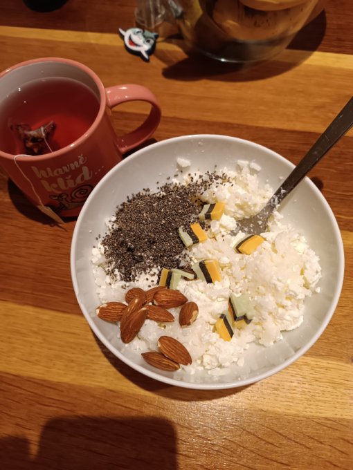 Ужин, хотелось бы раньше. Здесь смешала отваренный рис и зерновой творог, семена чиа, мармелад и миндаль
