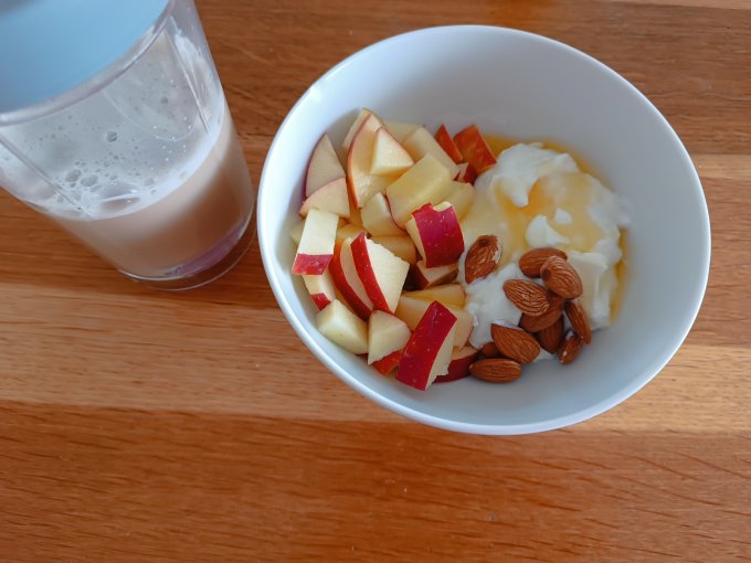 Перекус: смешала греческий йогурт, миндаль,яблоко и мед и записала протеином.