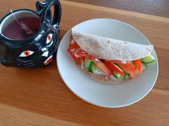 Перкус: лепешку обжарила, намазала греческим йогуртом,чуть подсолила, вложила огурцы, помидоры