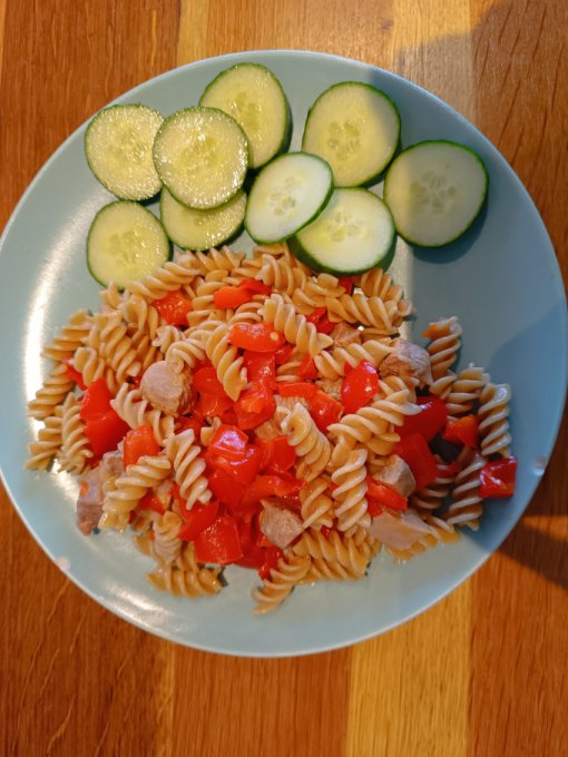 Обед: потушила индейку с перцем, добавила цельнозерновын макароны.