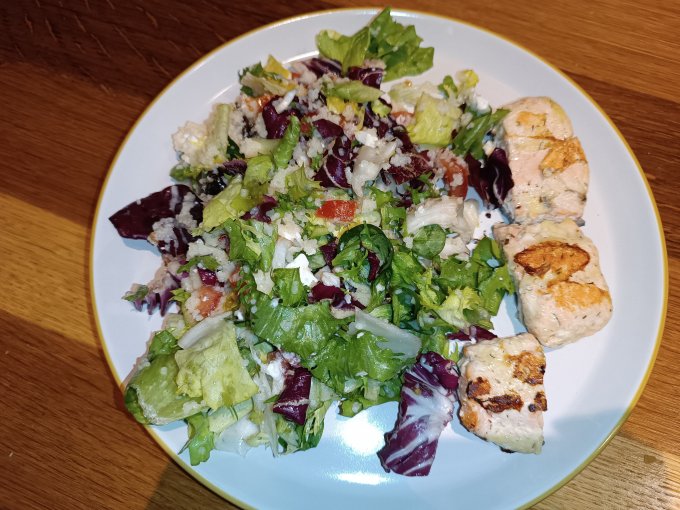 Мой идеальный ужин. Позже выложу рецепт салата, который обычно заказываю, если ем не дома: с зеленью, кус-кусом, медом и курагой.