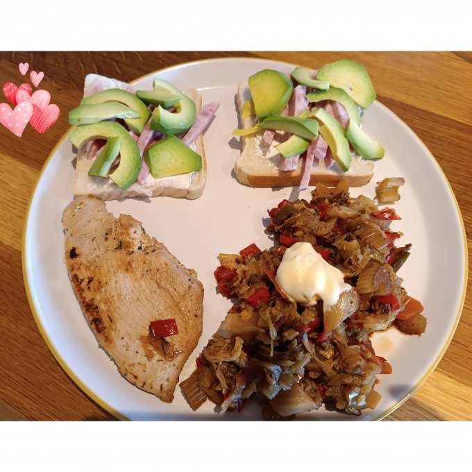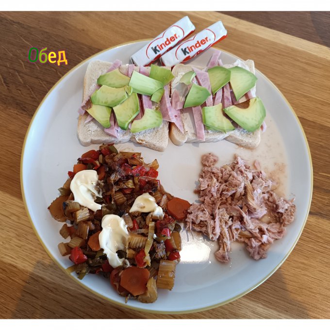 Обед: бутерброды с ветчиной и авокадо, печёные овощи и тунец