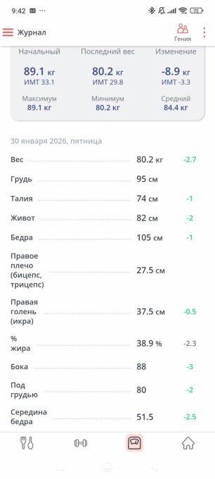 весах 80,8, ушло 4,2 кг, из них, к сожалению, 400 гр мышц😭но здесь