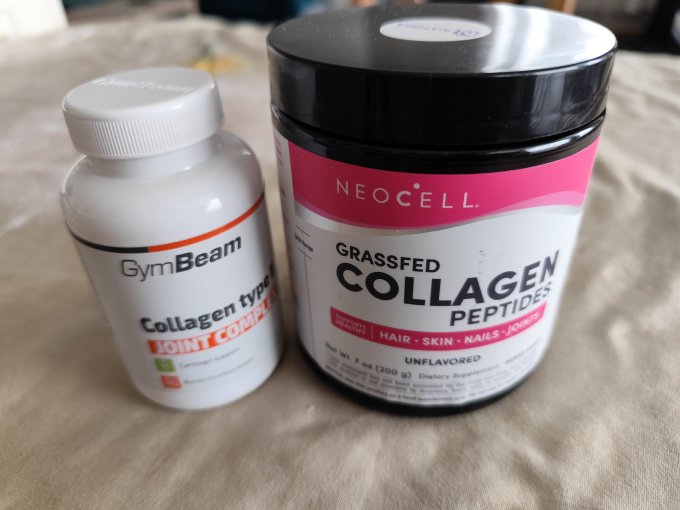 Я принимаю два вида коллагена: тип 2 для суставов и связок, и пептидный, с различными кислотами для кожи, волос и т.д. в порошковом виде (есть разная основа: морской и говяжий. Морской слишком для меня противный). Принимаю утром, вечером обязательно с витамином С