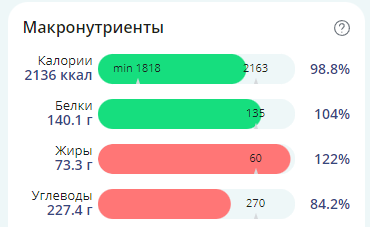 Вчера снова немного перебрал по жирам (120% от нормы), но выполнил по белкам. Углеводы продолжают страдать. А вот калории наконец-то близки к необходимым значениям, но нужно еще добавить: