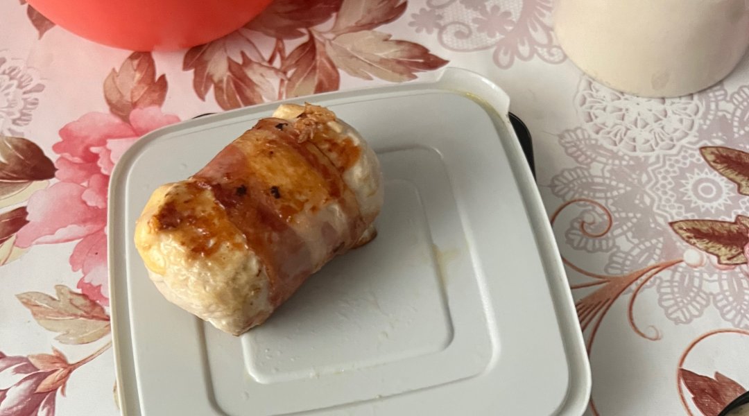 Положить внутрь сыр, свернуть рулетиком, как блинчик. Сверху обмотать беконом по ширине.