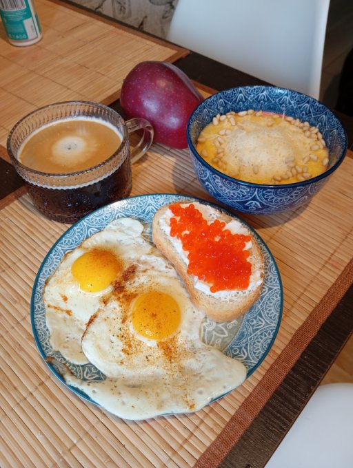Завтрак примирил меня немного с необходимостью раннего пробуждения. Полента с пармезаном и кедровыми орехами, яйцы, бутер, яблочко) шоколадка на работе)