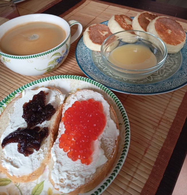 Завтрак... Налепила сырников из 800 г творога... Пока копалась стая саранчи умяла почти все. Пришлось завтрак бутерами дополнить. К сырникам остатки былой роскоши: наскребла 30 г сгухи и лимонного курда добавила. И то даже до 600 кк не дотянула
