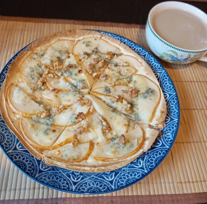 На завтрак "пицца" на тортилье с грушей и плесневелым сыром