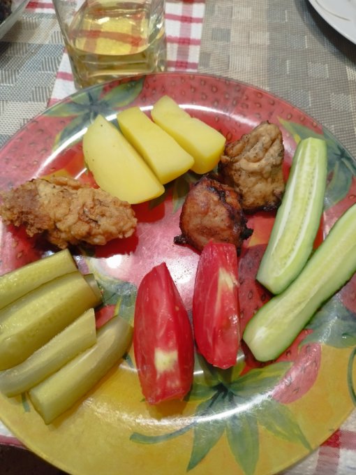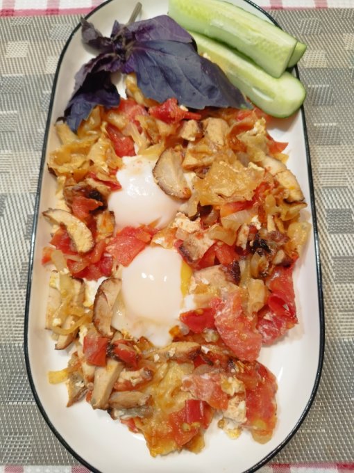 | Яичница с луком, мясом, помидорами и лавашом |