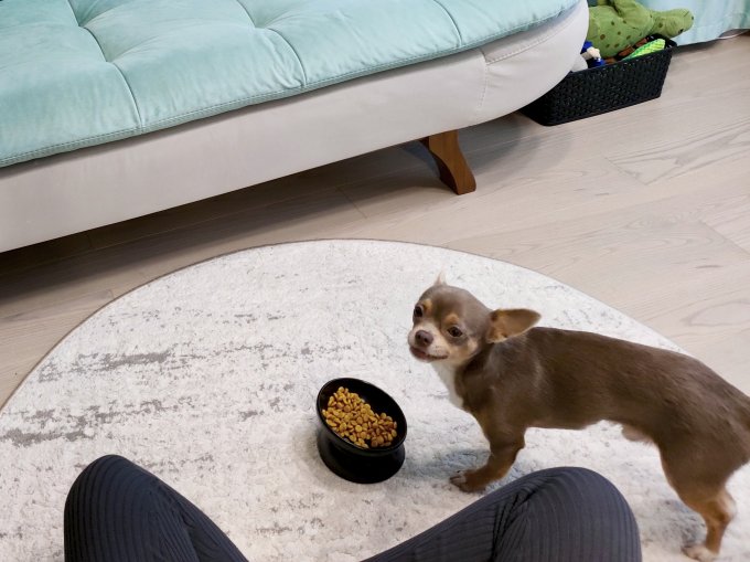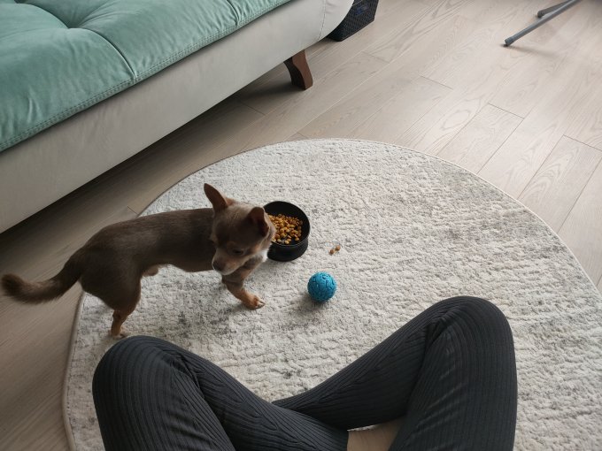 На фото как я обычно жду пока Фродо позавтракает в час дня. У него ритуал: подтянуться после сна, погулять, побегать/попрыгать/покусаться и потом он начинает подглядывать на корм.