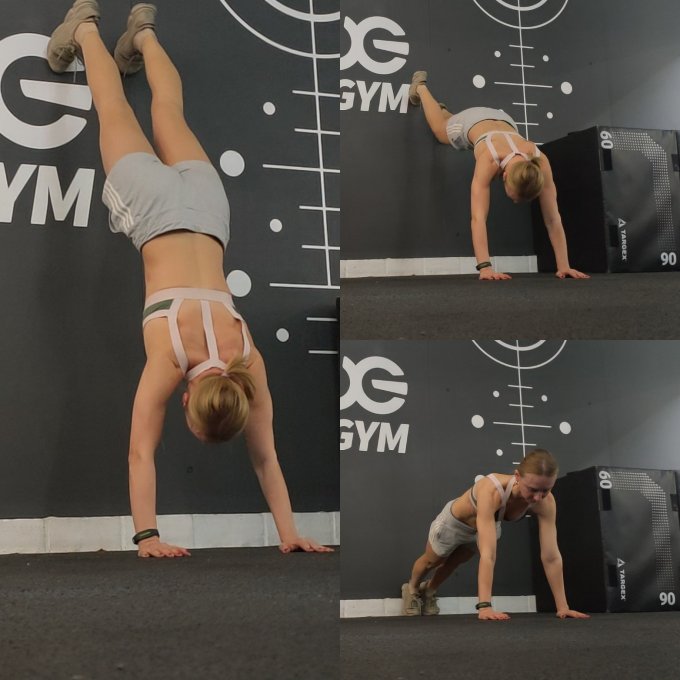 В общем сегодня я осмелела и решила походить из планки на стену в стойку на руках под углом и обратно в планку. С перерывом в минуту, сделала так 4 раза, не ахти какой результат, но раньше я и шага не могла сделать 😉