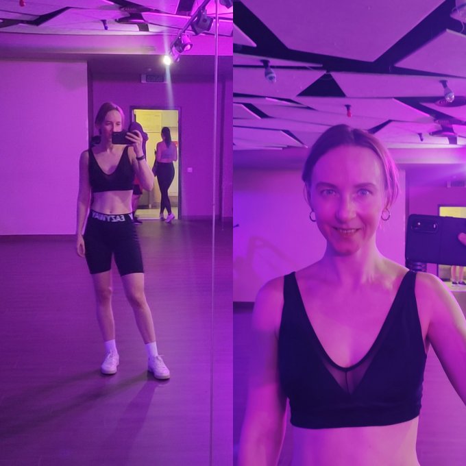 Связь с телом так себе, все движения не уверенные и косые, на кардио плохело, старалась поменьше прыгать, но в общем ничего, ушла довольная.